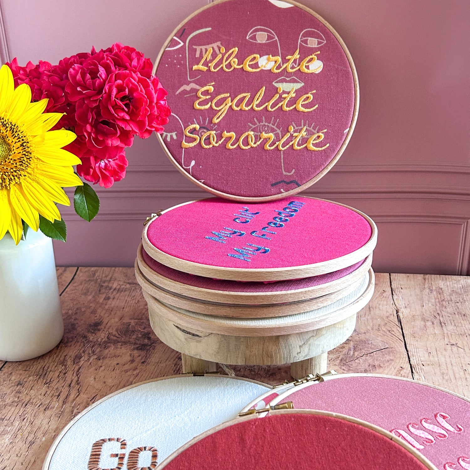 La Libérée, c’est une collection de cercles à broder qui claquent : des punchlines tendres ou