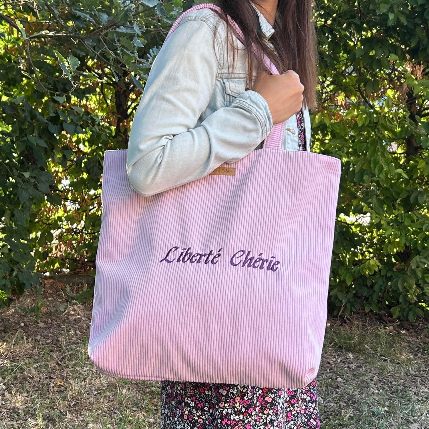 Un cabas qui en impose en velours côtelé, brodé de mots qui comptent et doublé de caractère.