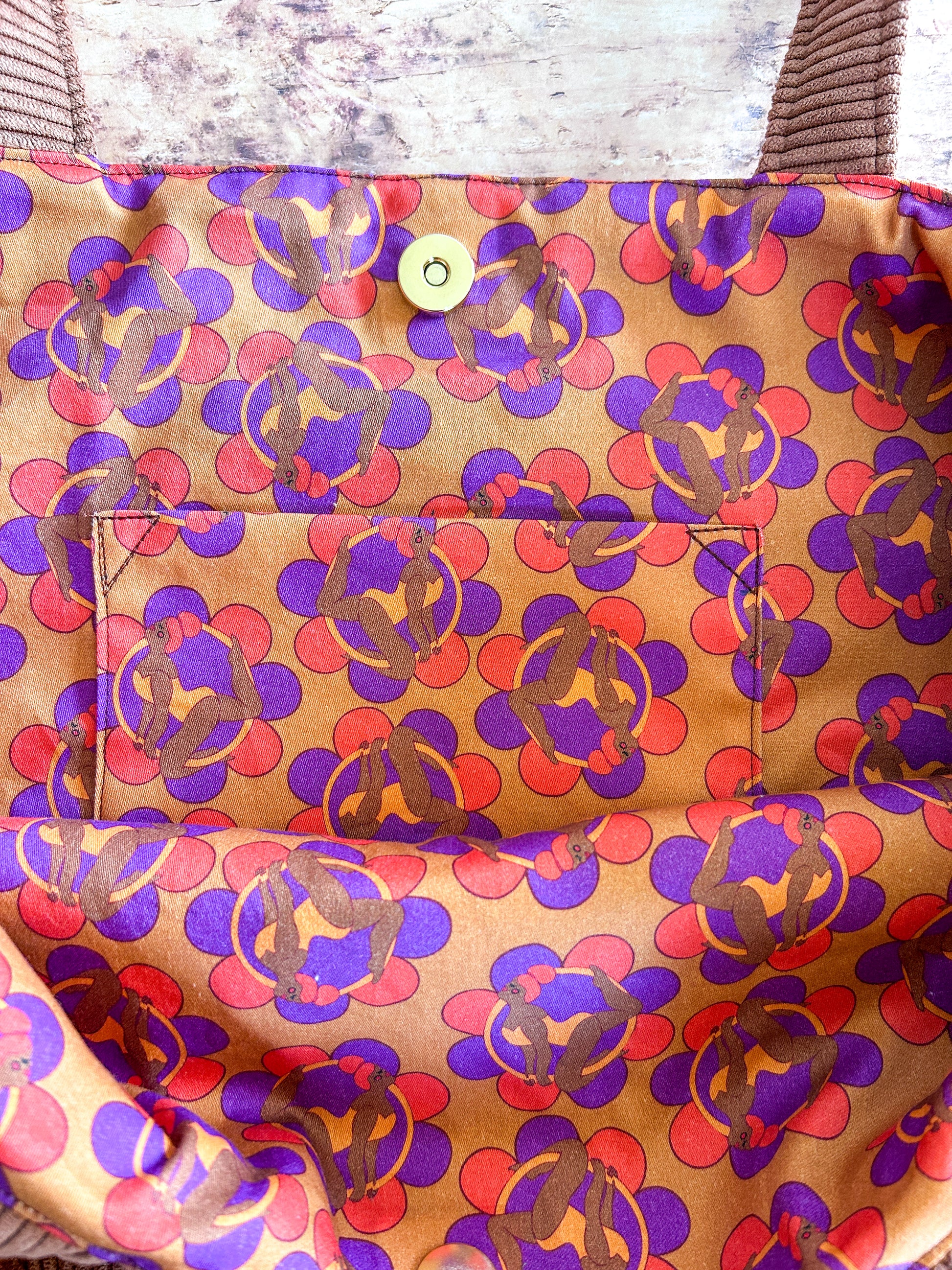 Un cabas en velours brun et coton imprimé L'Équilibriste