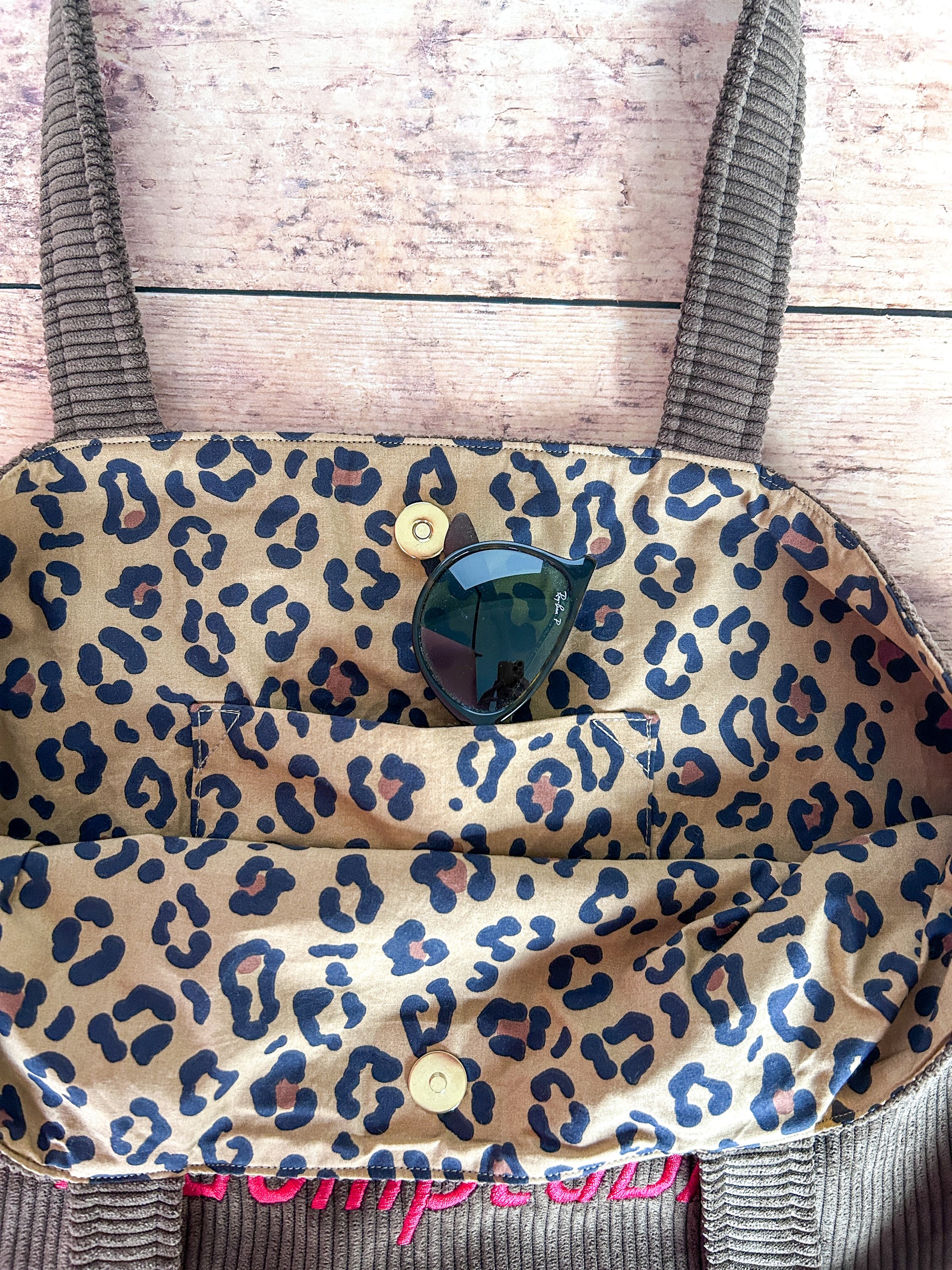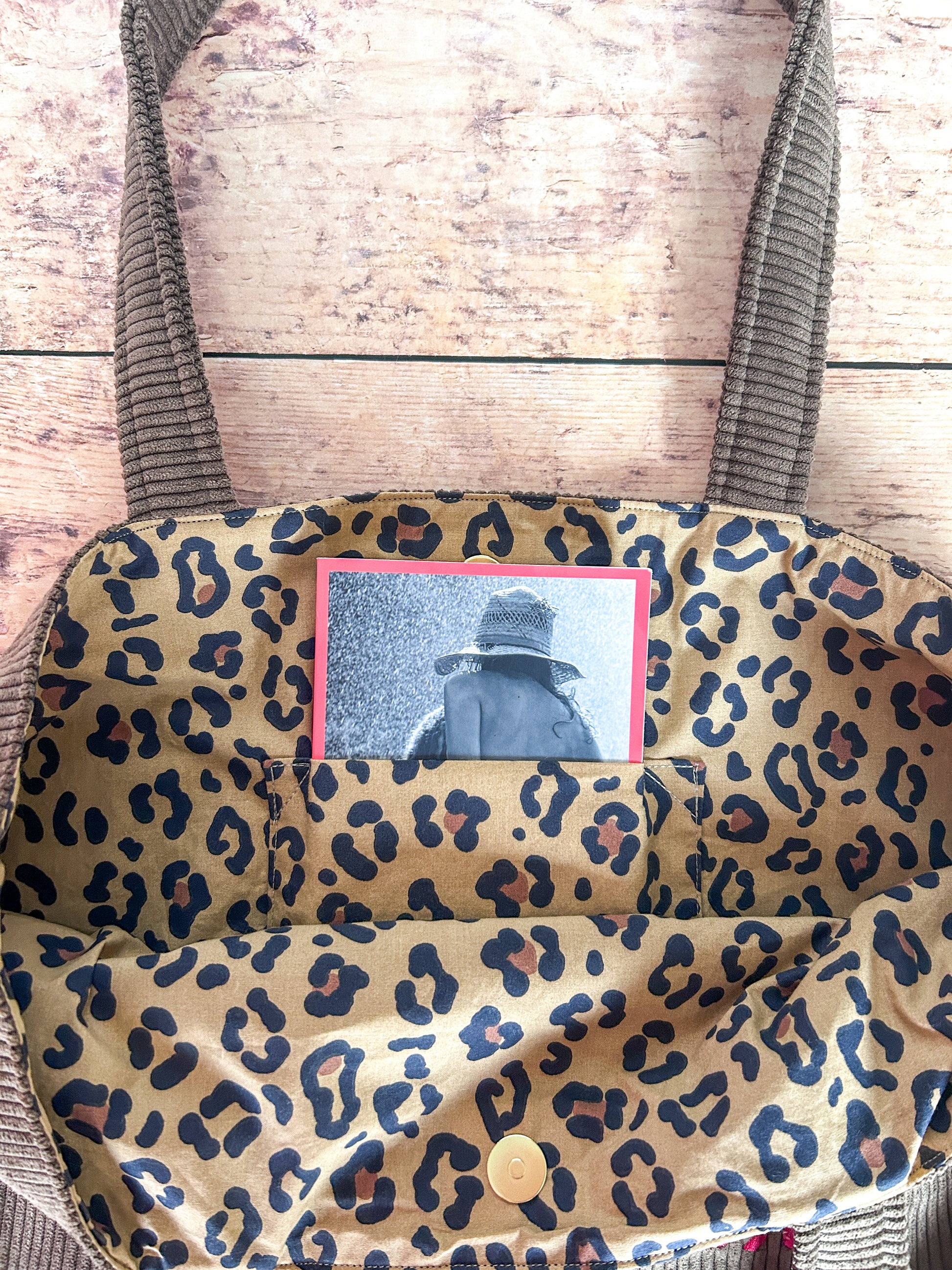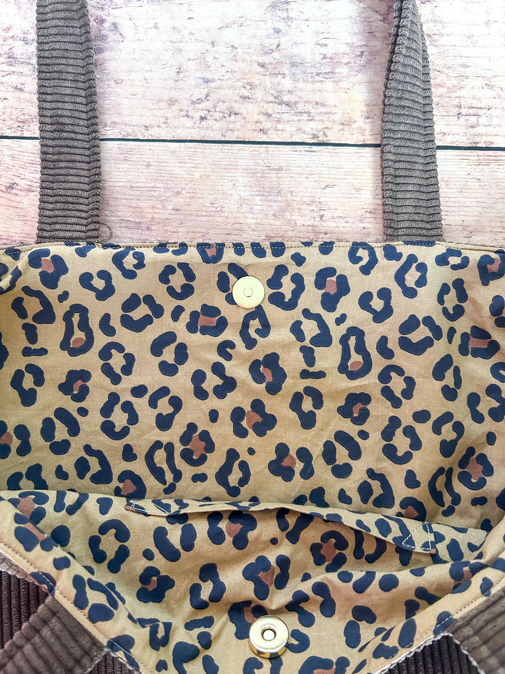 Un cabas en velours marron et coton imprimé La Féline