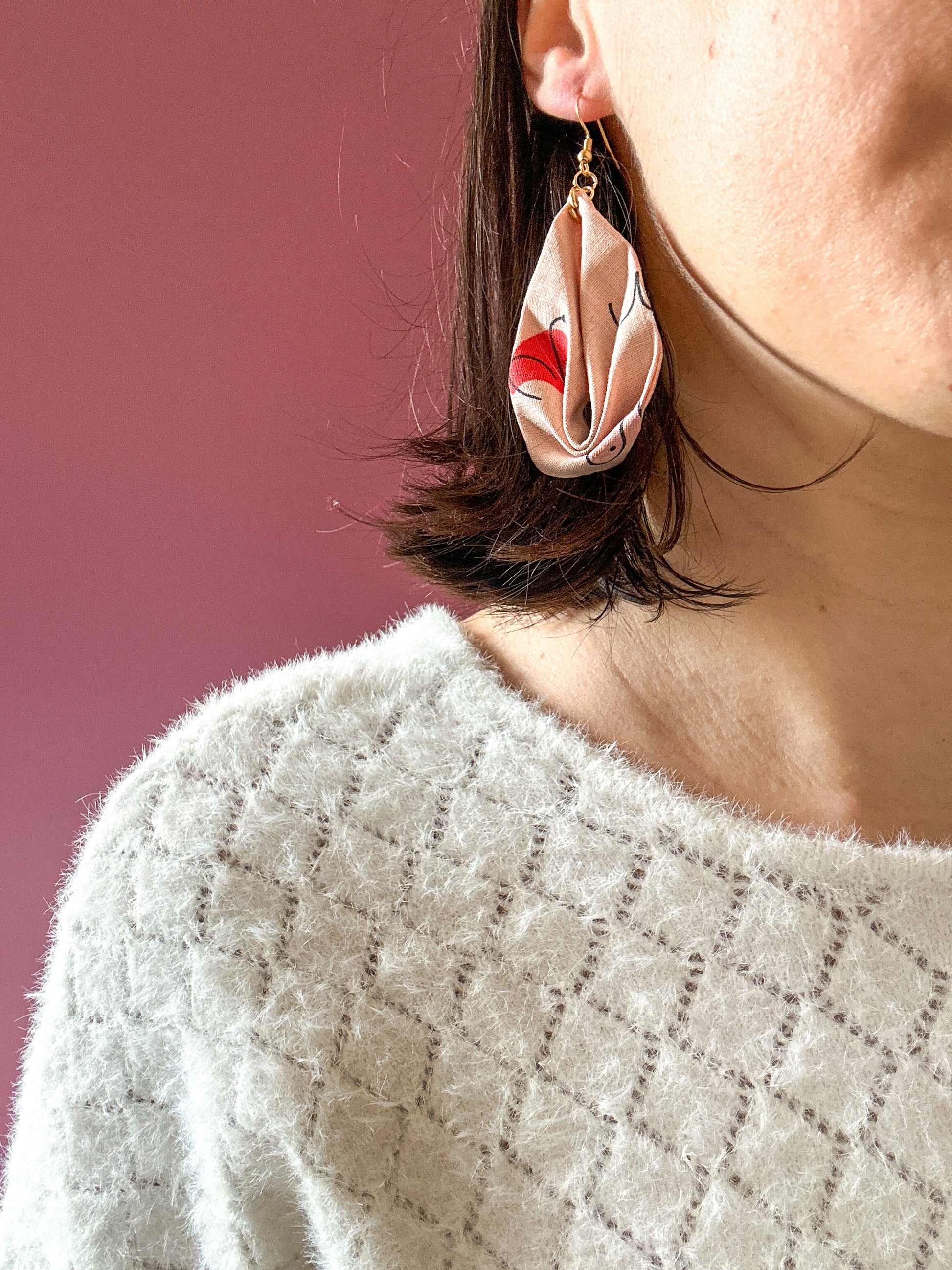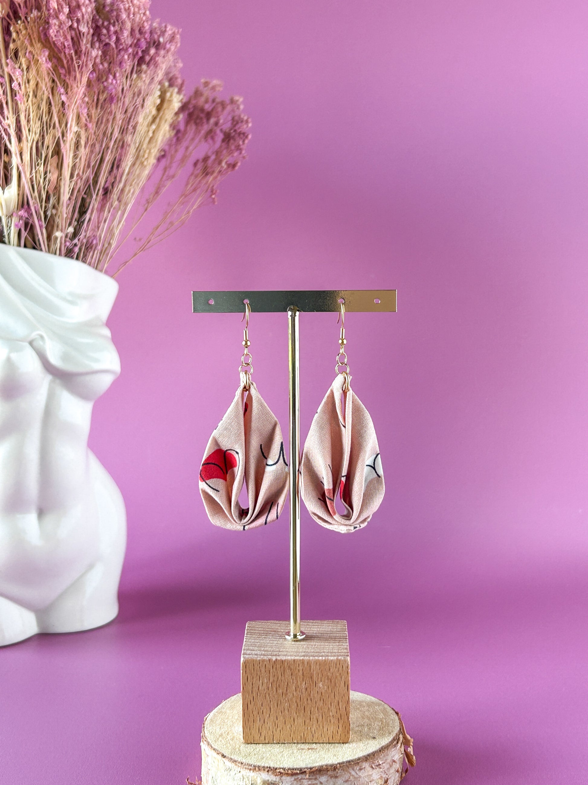 Matières : Boucles d'oreilles en tissu et acier inoxydable, très légères et agréables à porter.