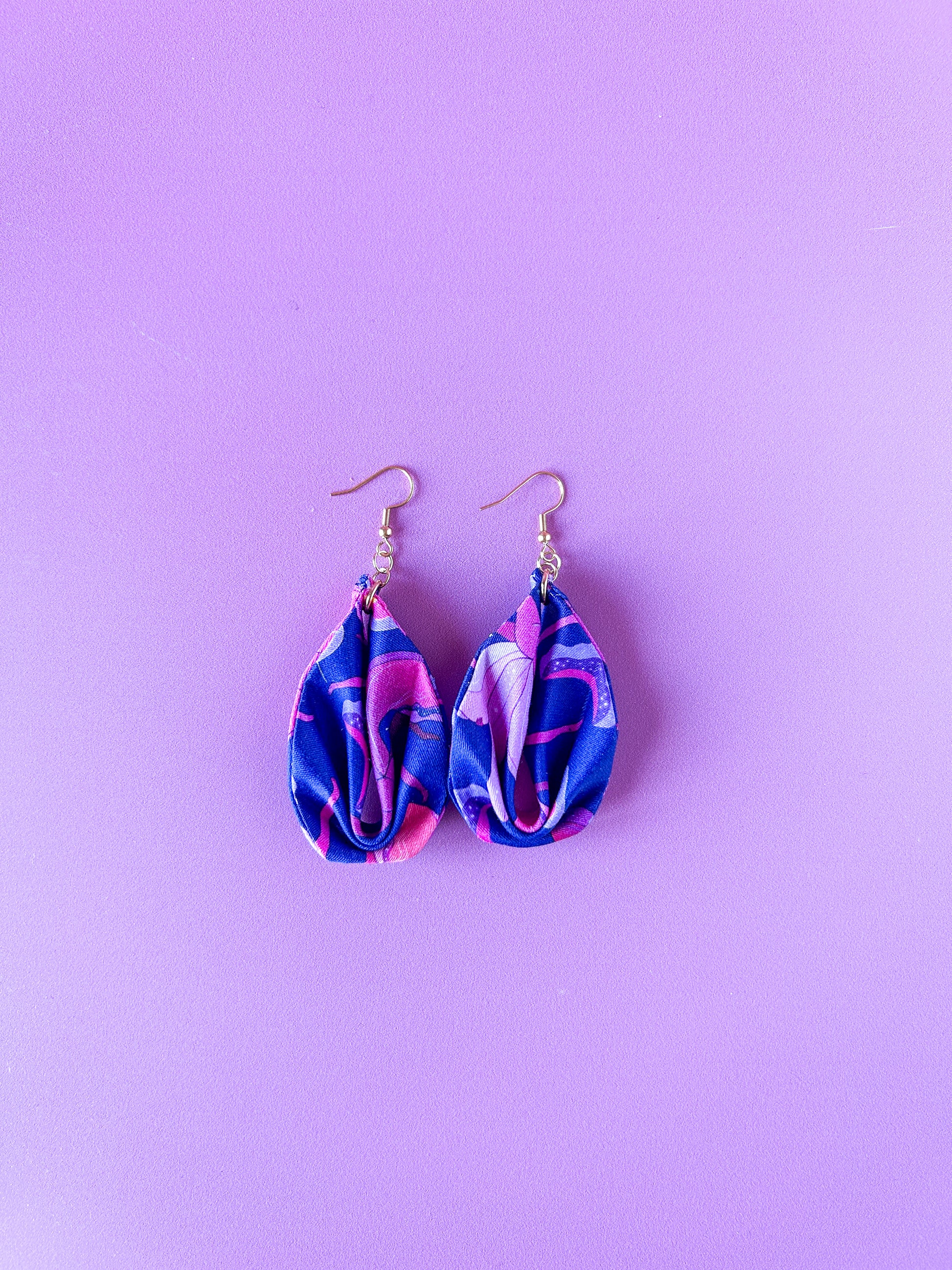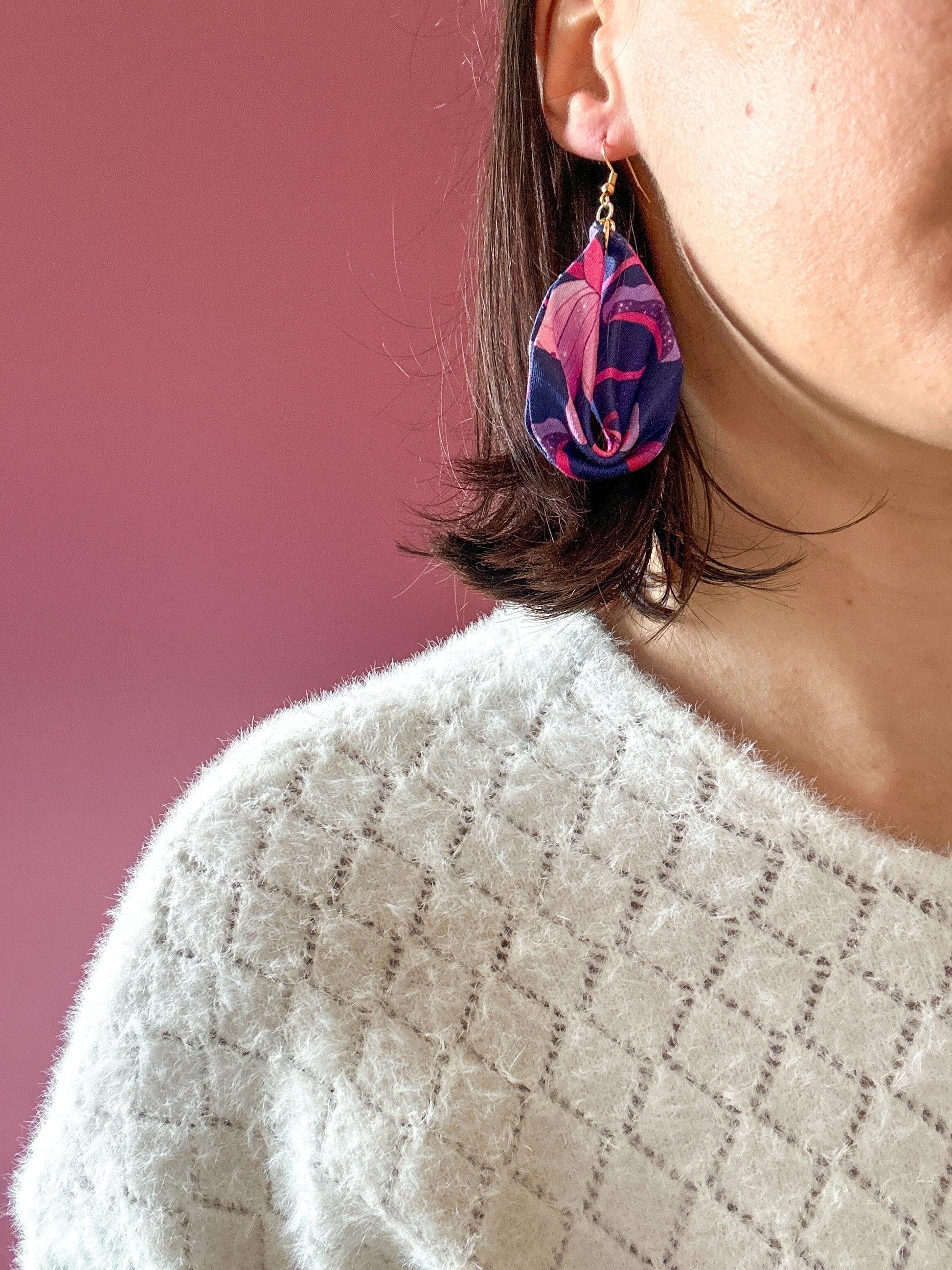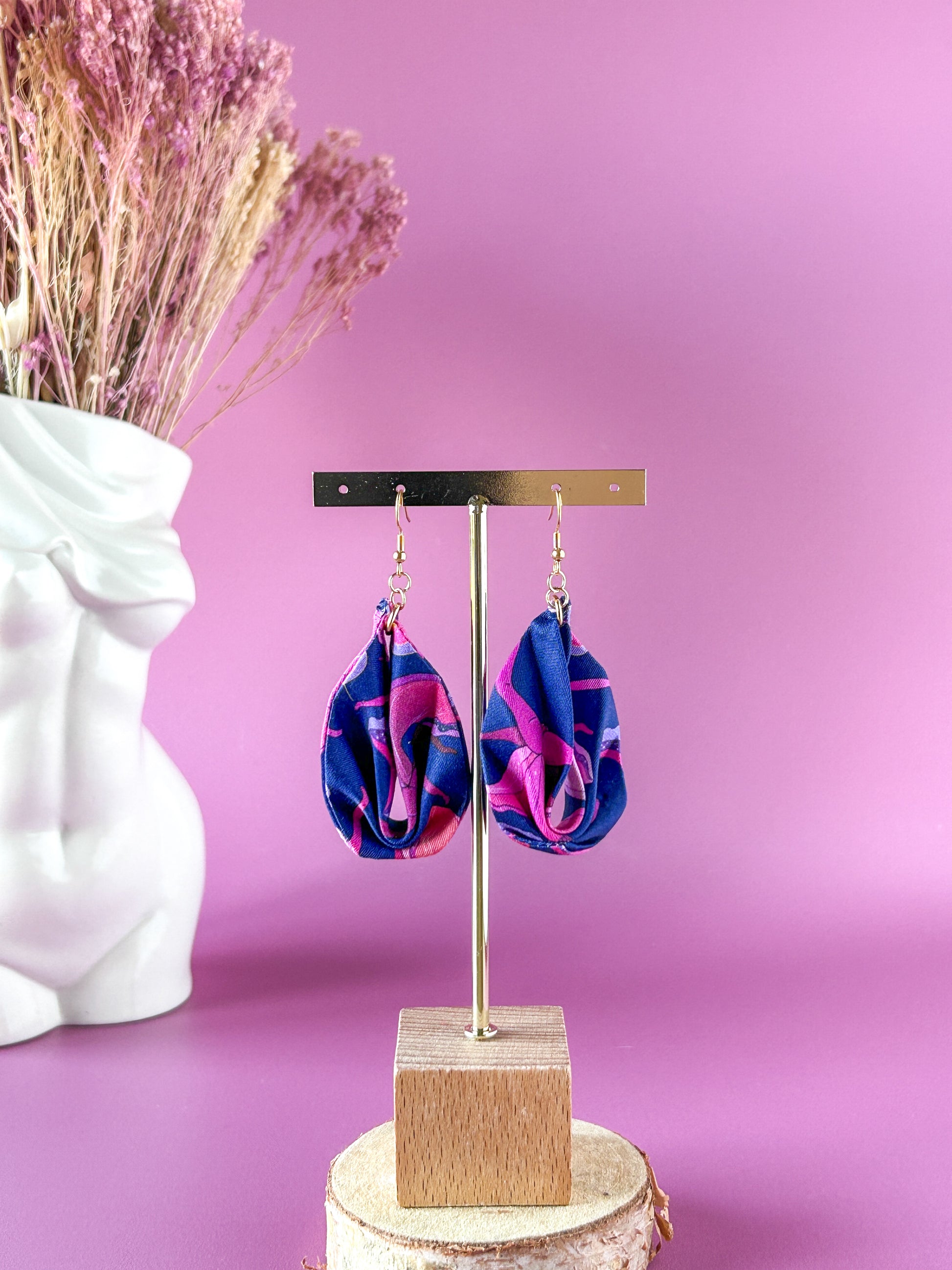 Matières : Boucles d'oreilles en tissu et acier inoxydable, très légères et agréables à porter.