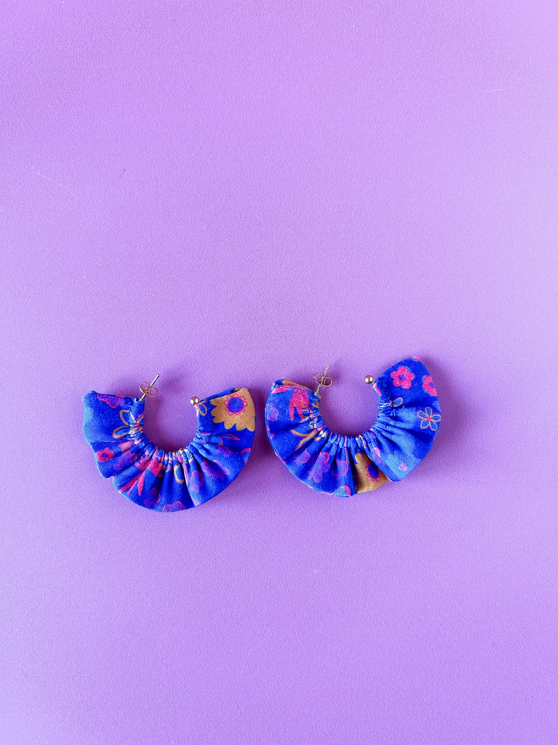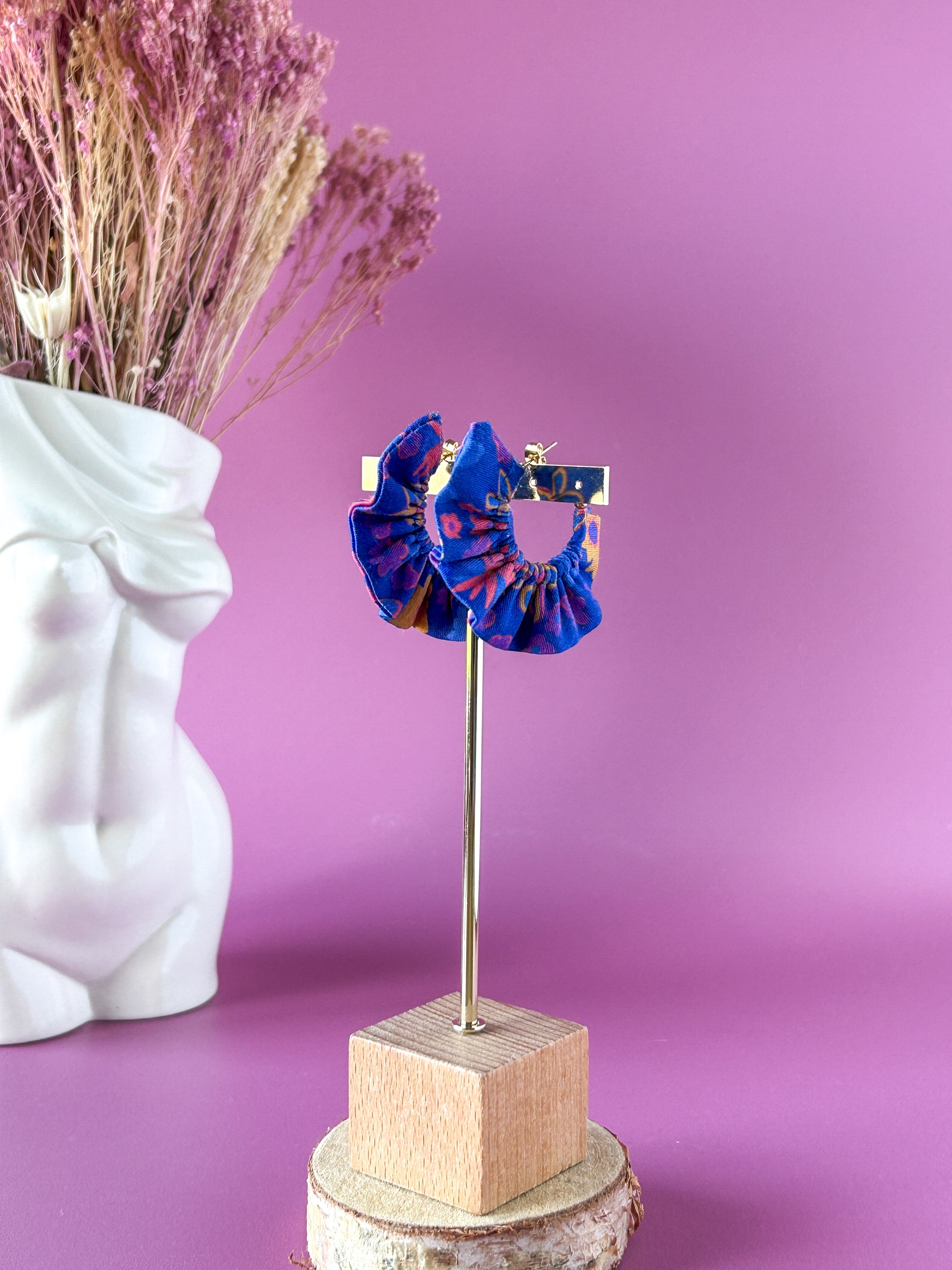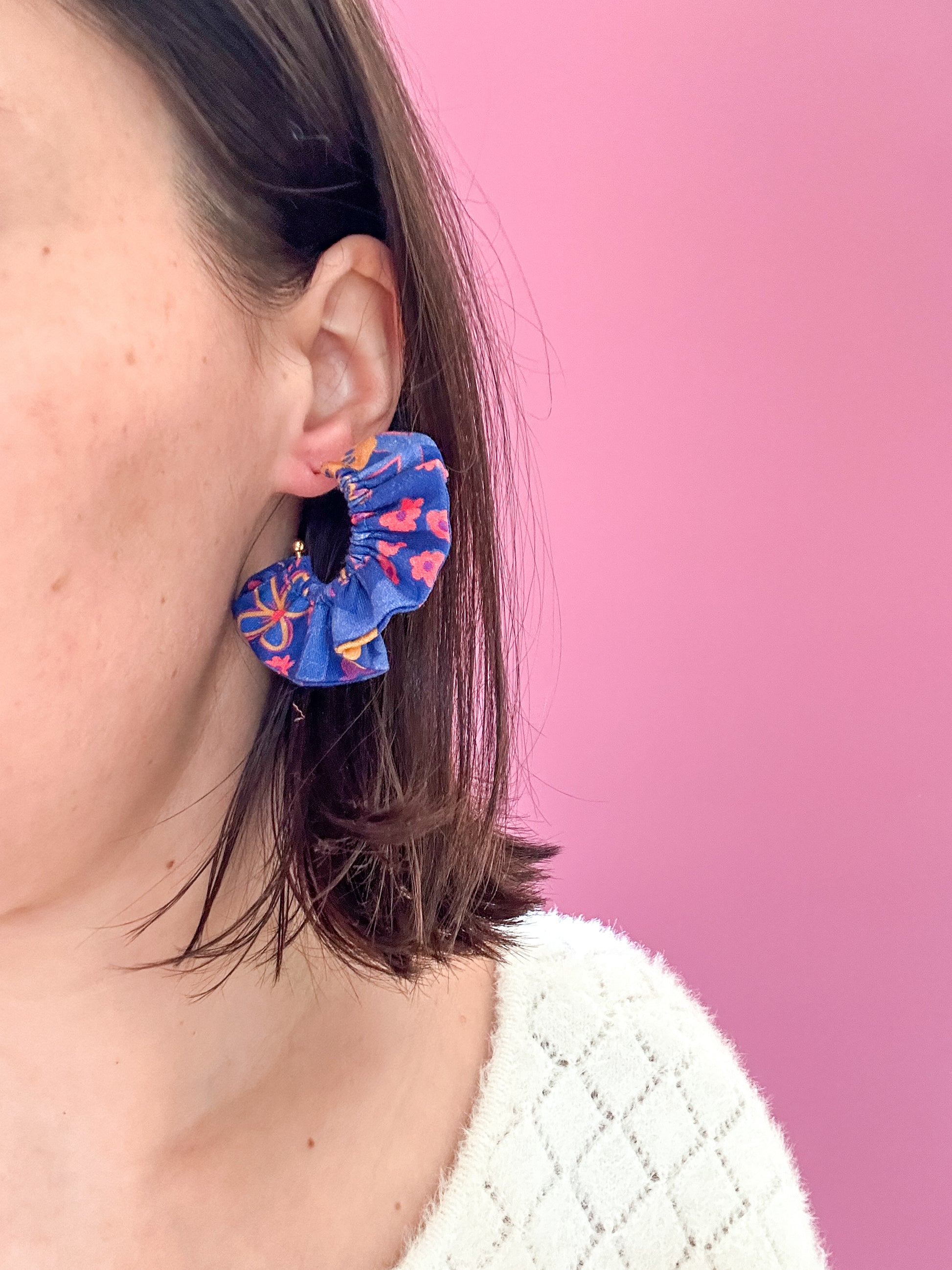 Matières : Boucles d'oreilles en tissu et acier inoxydable, très légères et agréables à porter.