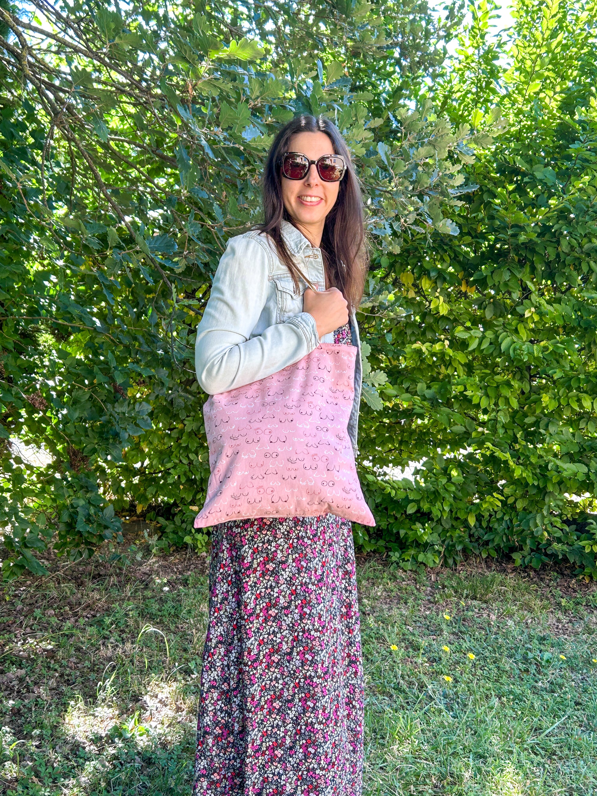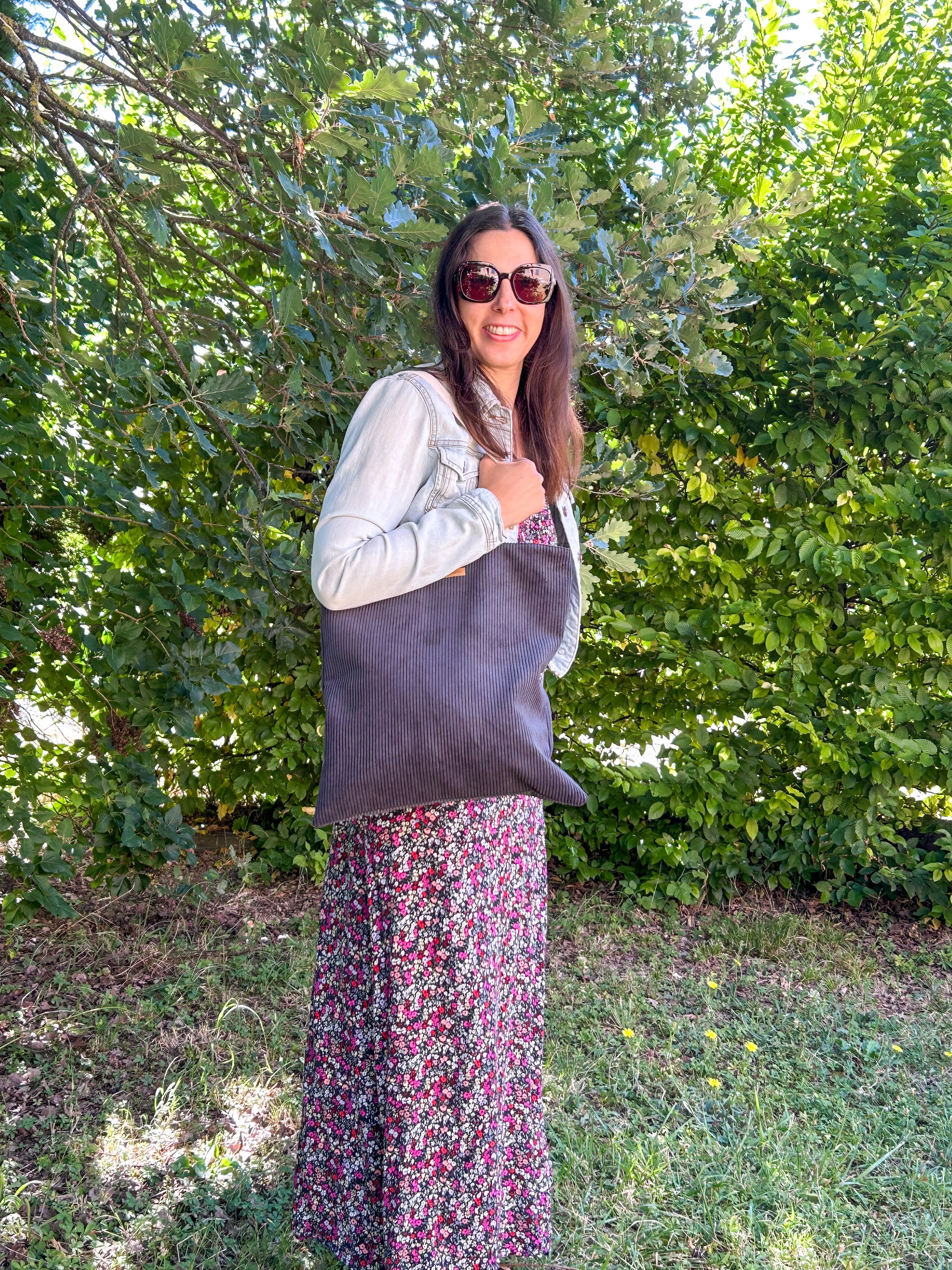 Un tote bag réversible en velours noir et coton imprimé La Libérée